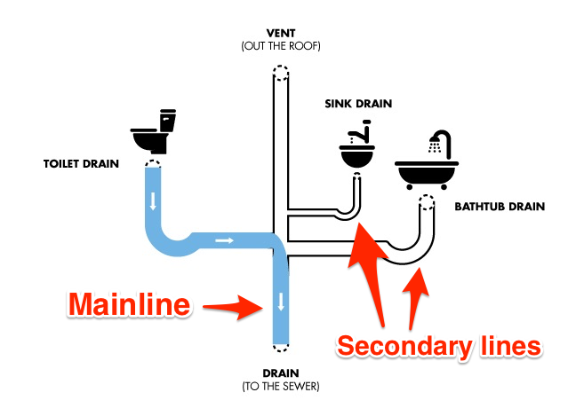 - Secondary line: These drain lines are attached to water fixtures in your home (e.g., toilets, tubs, sinks, etc.), and they carry wastewater to your mainline, which then feeds to a sewer line or septic system.